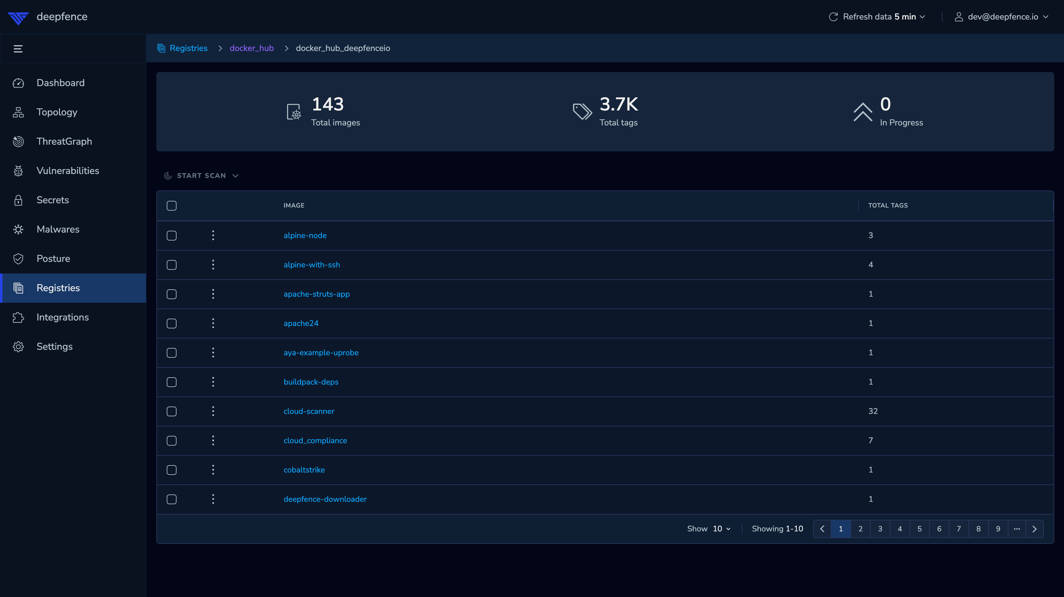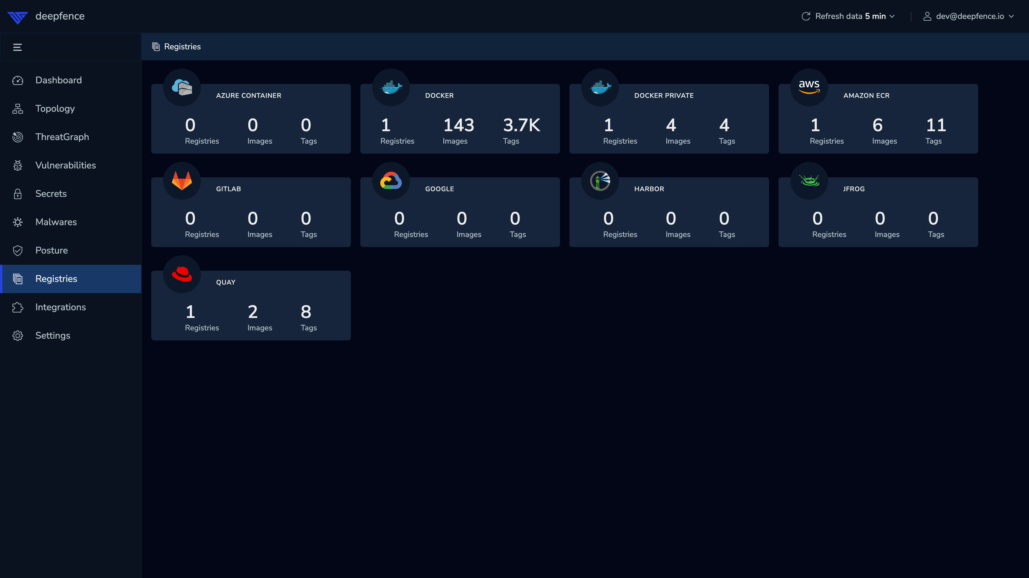 You can scan for vulnerabilities in images stored in AWS ECR, Azure Container Registry, Google Cloud Container Registry, Docker Hub, Docker Self-Hosted Private Registry, Quay, Harbor, Gitlab and JFrog from the registry scanning dashboard.